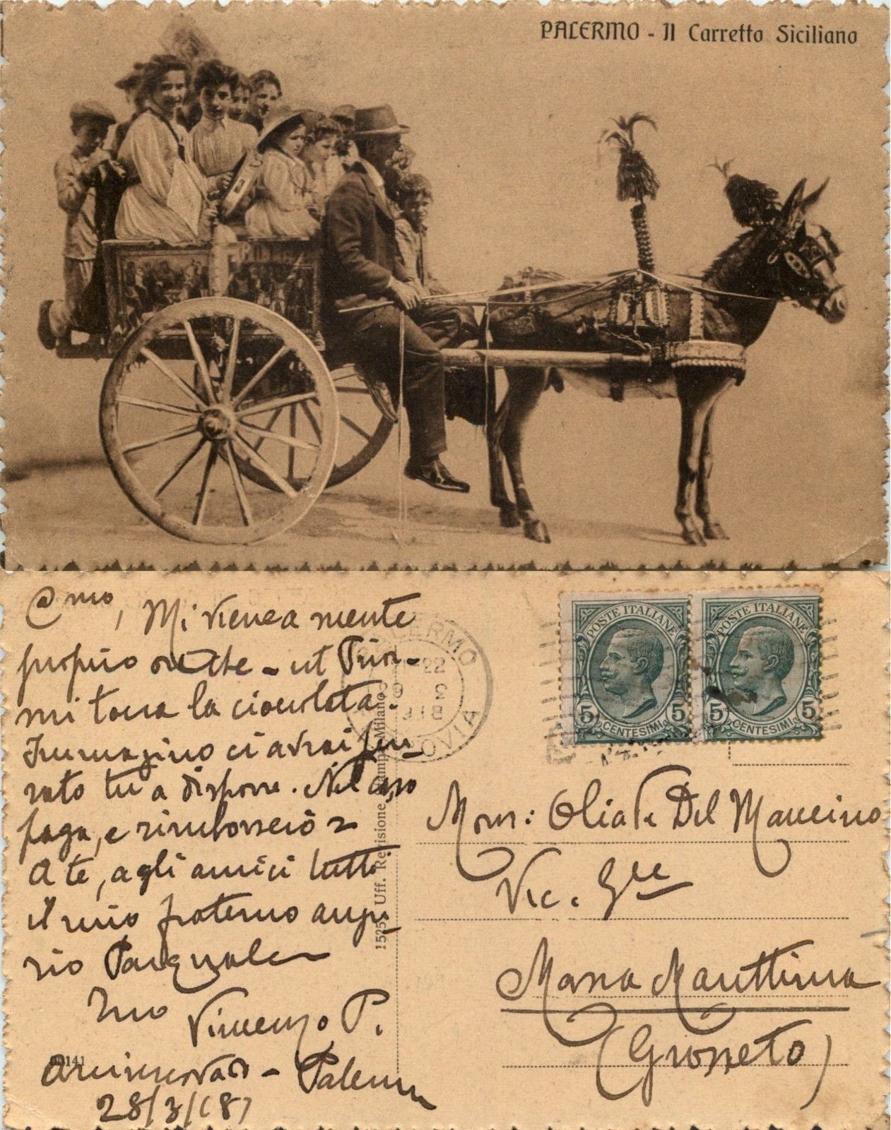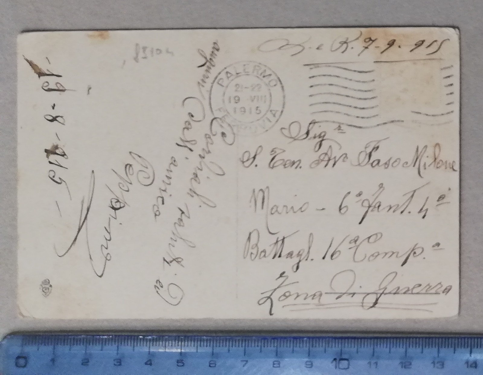 In the Vittoriano Museum they stated that recipient of postcard is “Maggiore Polizzi” because the read the handwritten text on the date stamp as “Mag” (that is military rank major abrrevated), but i see that it is more like an “R” sa it sounds “Rag. Polizzi Celeste” that is