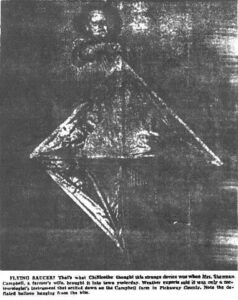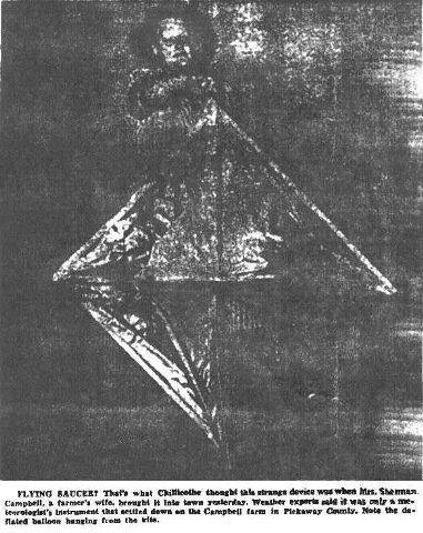 Firstly, S&R describe (p.6) a superficially-similar story from Circleville OH: “On July 5, 1947, Sherman Campbell found a strange object on his farm in Circleville, Ohio. The local sheriff identified it immediately as a weather balloon, and on July 6 there were pictures printed in papers around the country of Mrs. Campbell holding the kitelike structure.” Here’s a picture from Patrick Gross’s useful site, printed in the The Columbus Citizen, Columbus, Ohio, USA, on July 6, 1947: