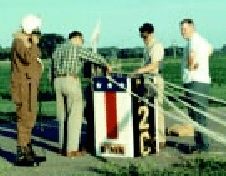 Don Piccard in a fur-lined Japanese flight suit, next to three other men and the gondola he used for his Feb 1947 Fu-Go balloon flight.