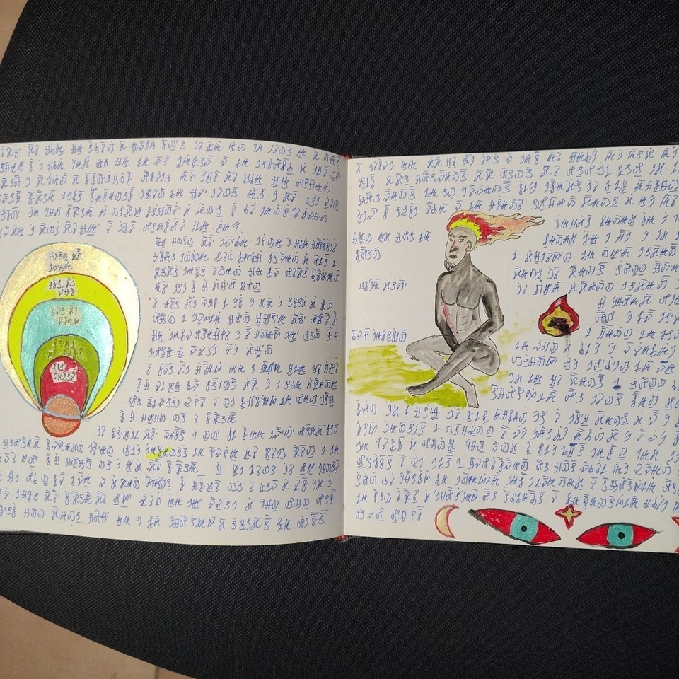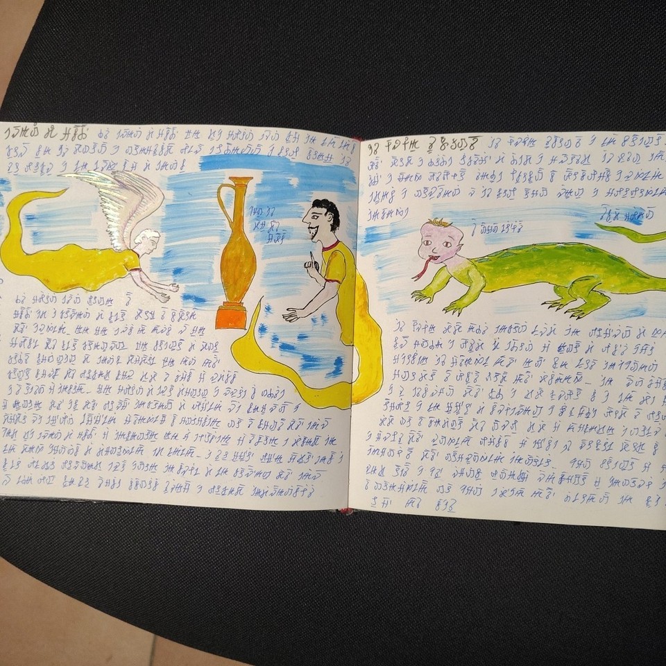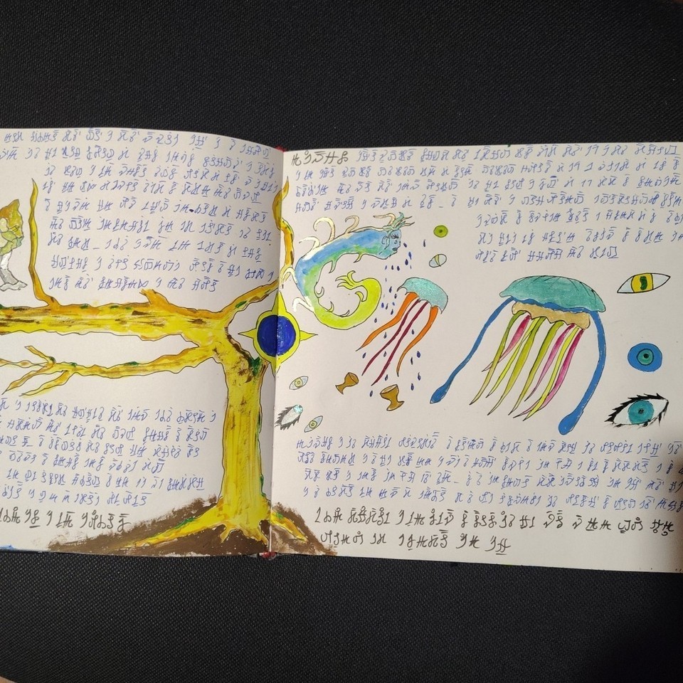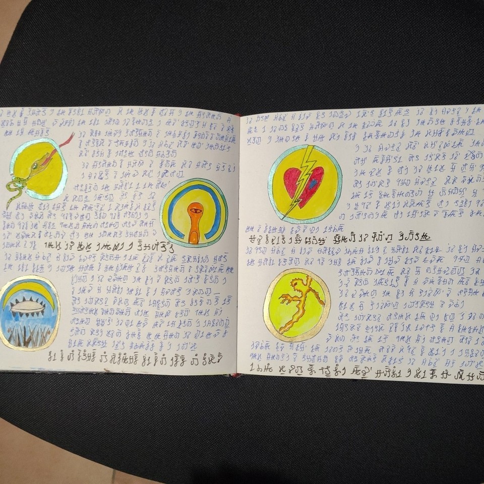 A manuscript book of unknown, non-ancient origin, written entirely in an indecipherable language composed of symbols, signs, and words. The pages feature colorful illustrations, diagrams, and visually striking figures.