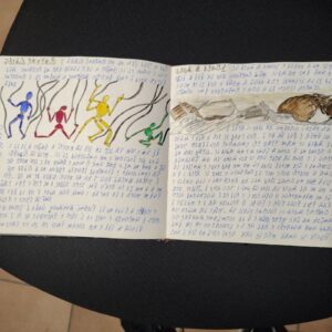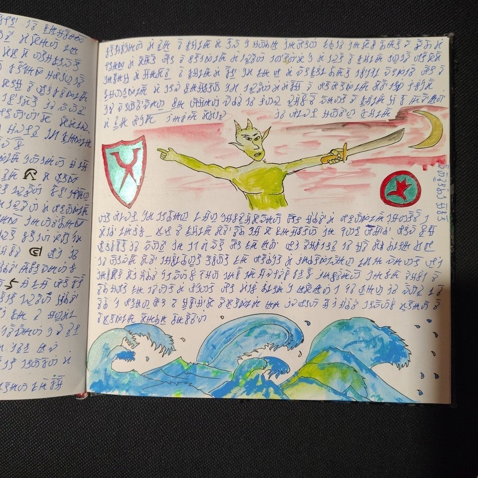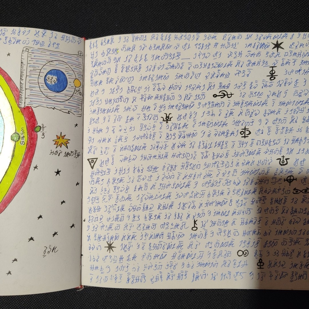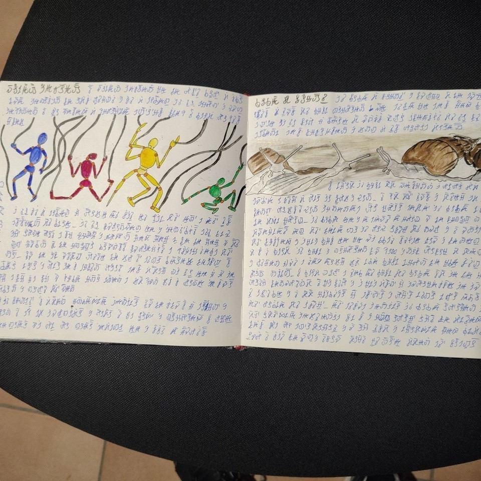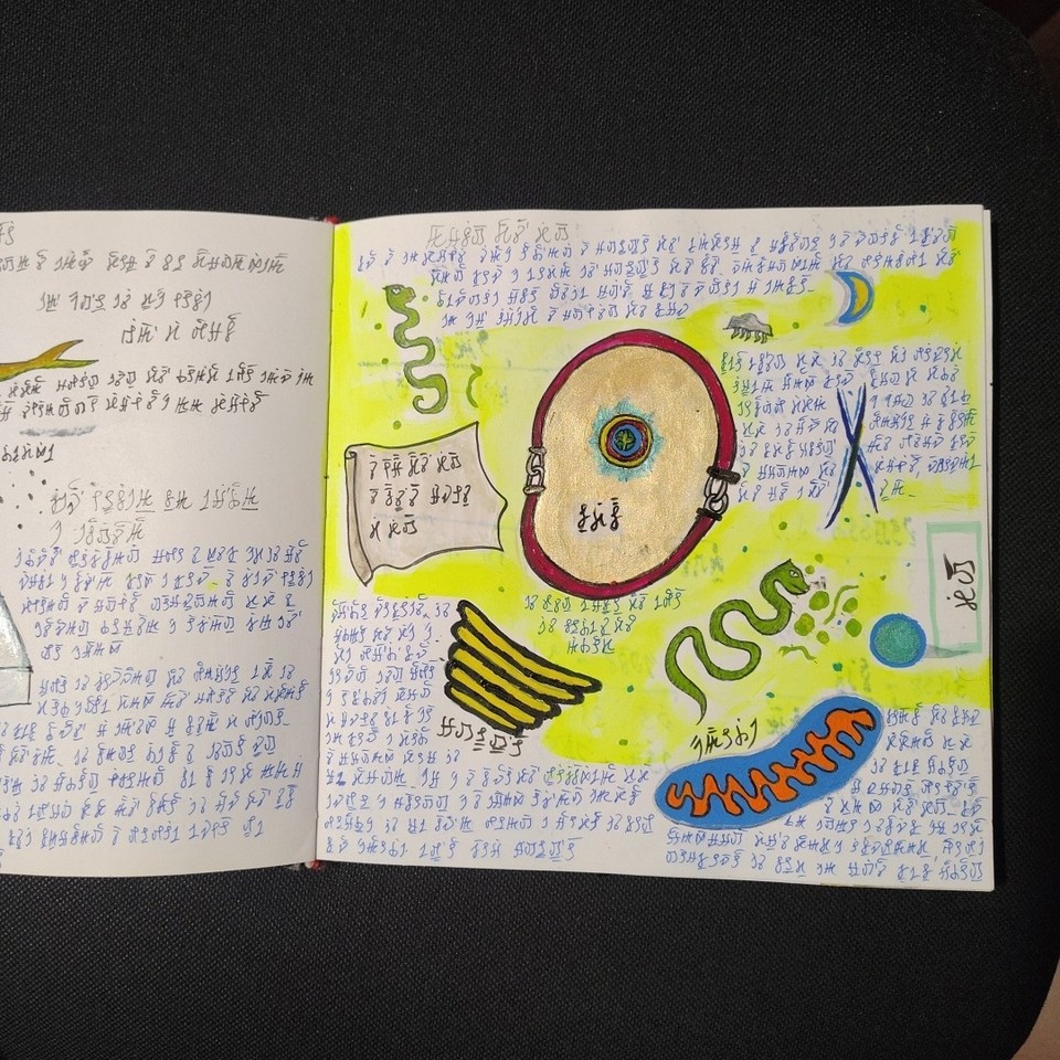 A manuscript book of unknown, non-ancient origin, written entirely in an indecipherable language composed of symbols, signs, and words. The pages feature colorful illustrations, diagrams, and visually striking figures.