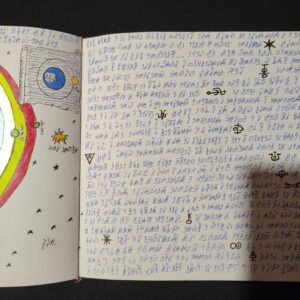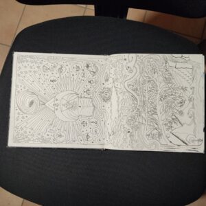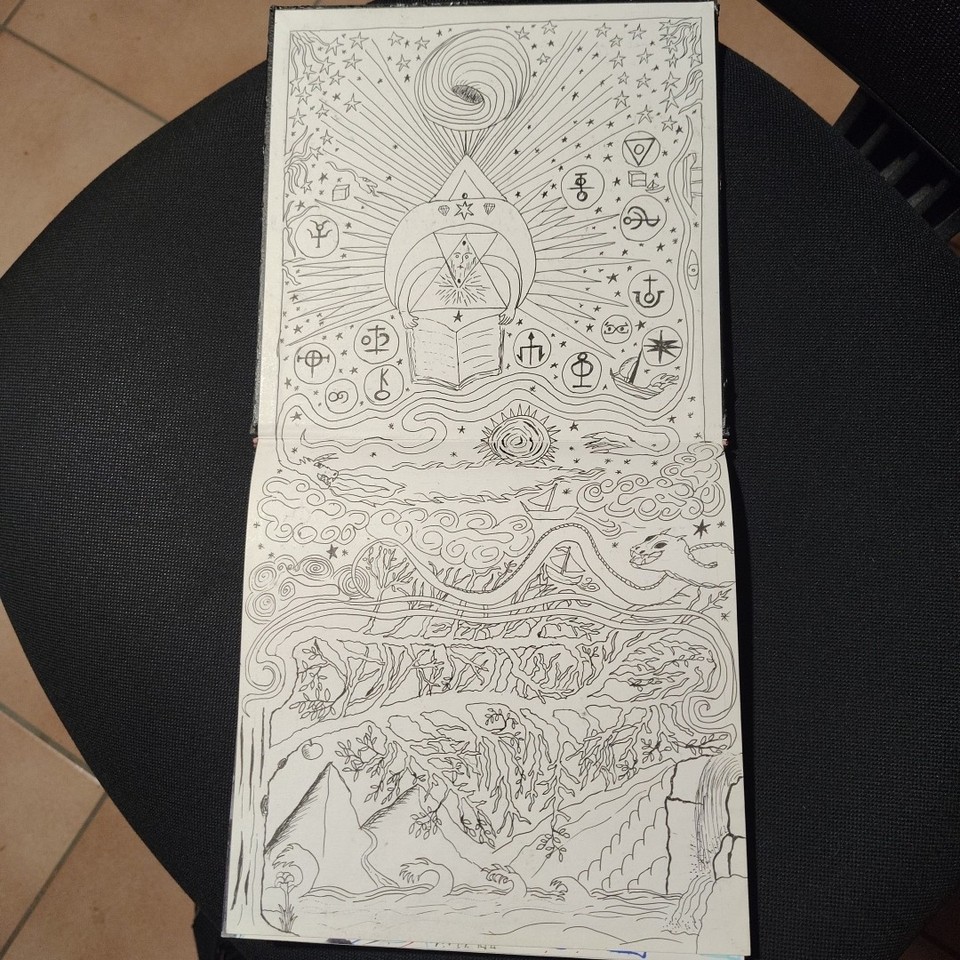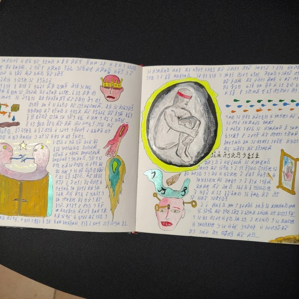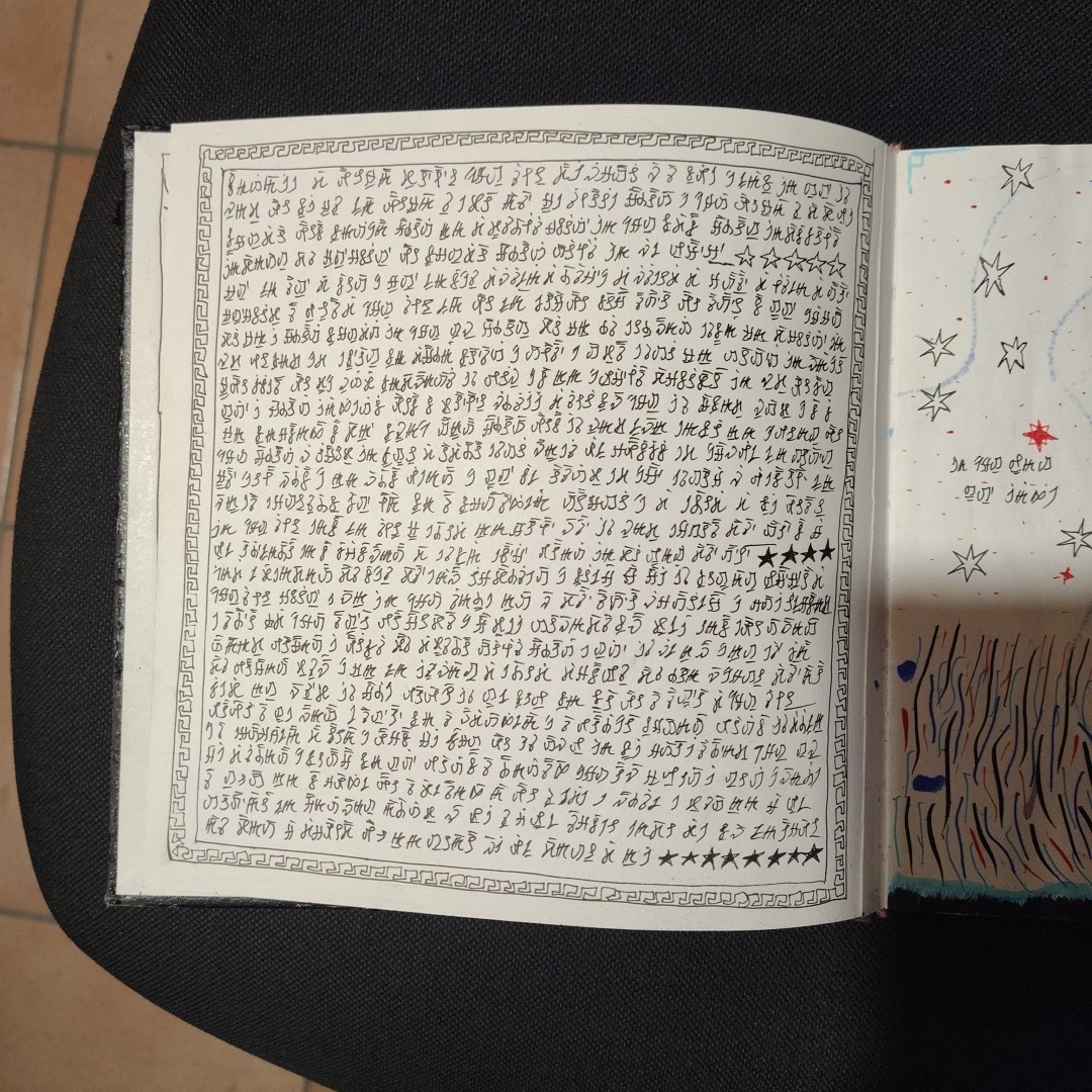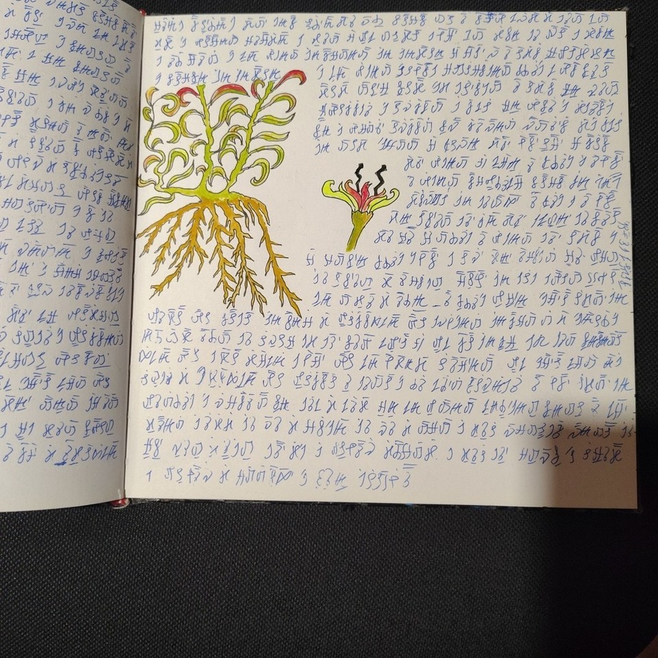 The volume comprises 108 pages, 21×21 cm in size, traditionally bound. Each page is different, densely detailed, and rich with elements that seem to belong to an unknown language or culture. The work has an ancient and mysterious aura, difficult to place, and retains a special charm that invites exploration. Ideal for collectors, artists, scholars, or lovers of mystery, secret codes, and extraordinary manuscripts. A rare, fascinating, and one-of-a-kind object.