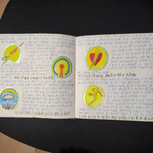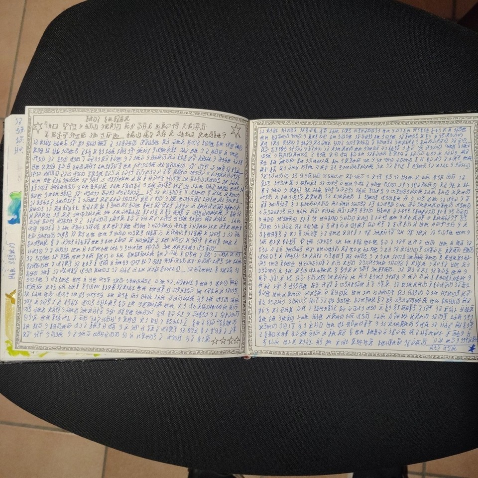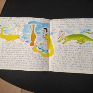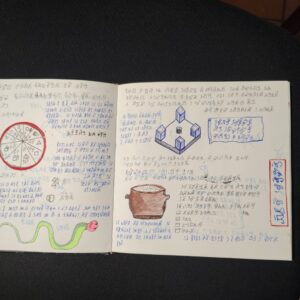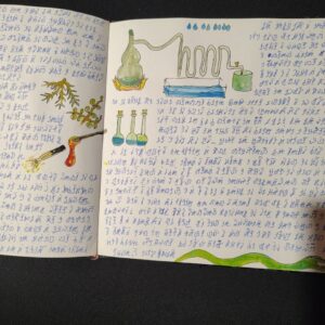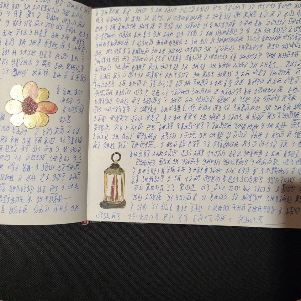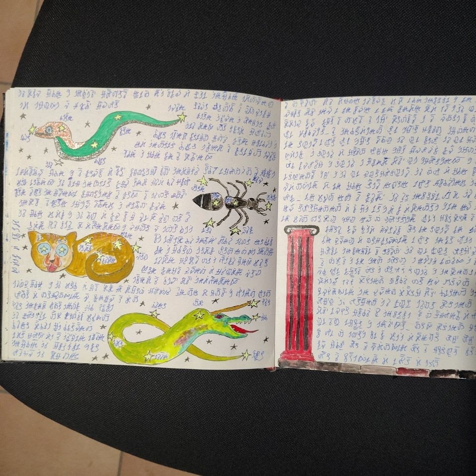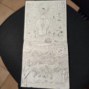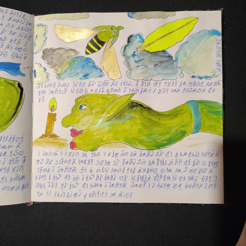 The volume comprises 108 pages, 21×21 cm in size, traditionally bound. Each page is different, densely detailed, and rich with elements that seem to belong to an unknown language or culture. The work has an ancient and mysterious aura, difficult to place, and retains a special charm that invites exploration. Ideal for collectors, artists, scholars, or lovers of mystery, secret codes, and extraordinary manuscripts. A rare, fascinating, and one-of-a-kind object.