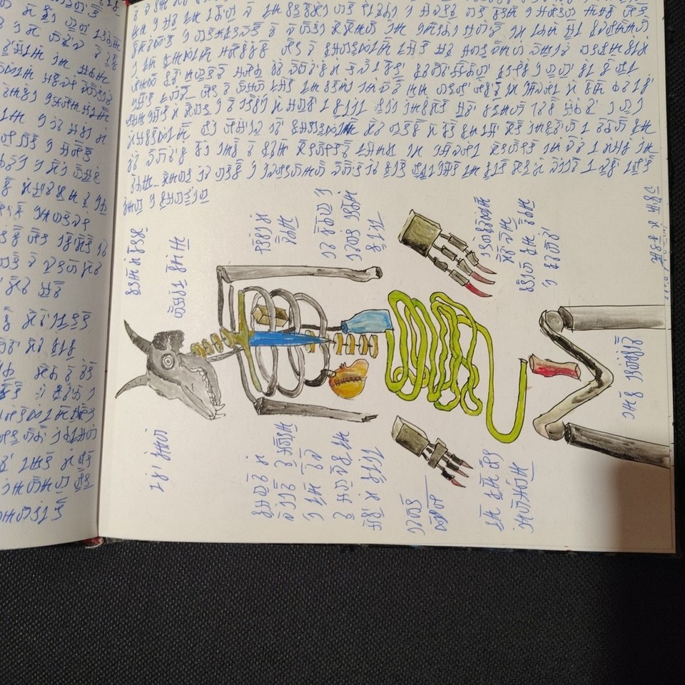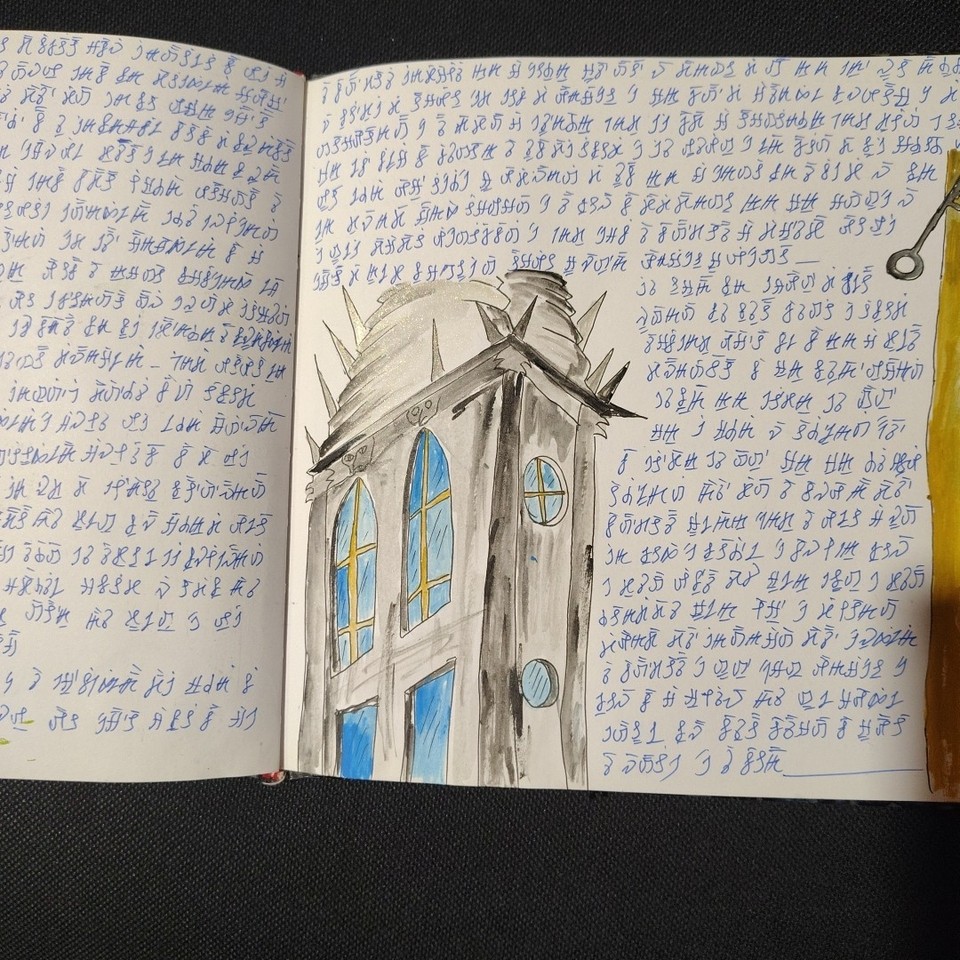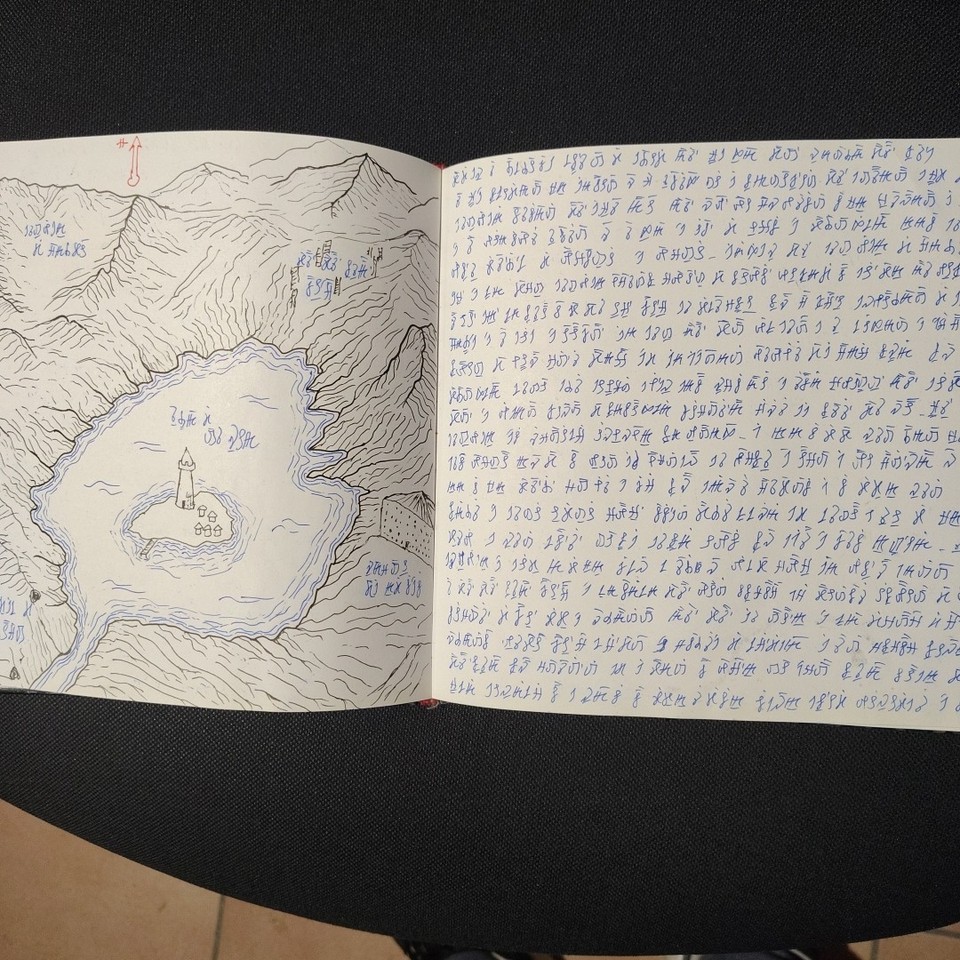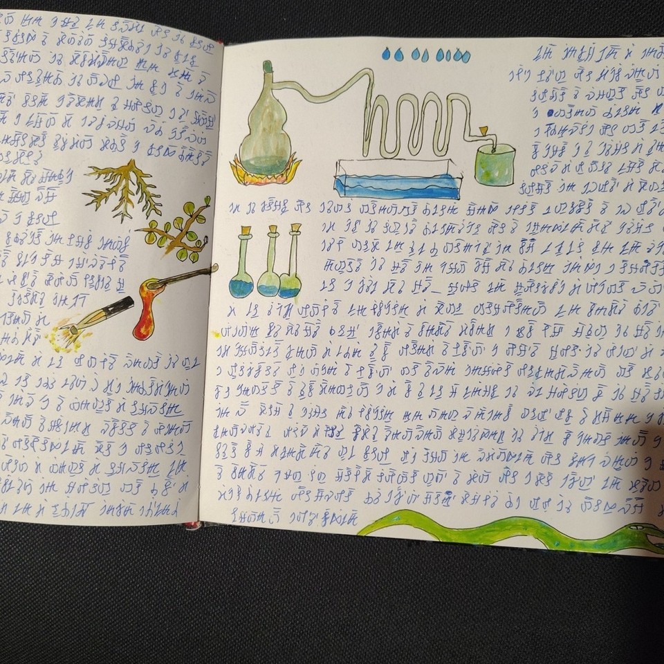 Well, obviously there’s a bit of a Voynich influence going on (the castle is a bit of a giveaway), but – unless you know better? – it looks more like a fun art project (kind of a poor man’s Codex Seraphinianus) than some kind of Rosicrucian secret. More simulacrum than simulation, let’s say. So I’m guessing its cipher can’t actually be broken, but I could easily be wrong.